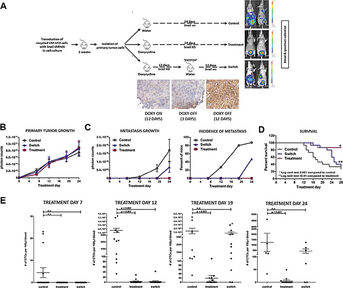 Figure 10: Inducible knocking down of SNAIL affects CTC and metastasis formation. (A) Schematic of the 3-arm UM-UC3 SNAIL knockdown experiment with IHC staining for the “switch” group. After transduction in vitro, cells were orthotopically injected and primary tumors were grown for 2 weeks. Cells from primary tumors were isolated and inoculated in 50 mice. Mice were randomized into one of three arms (15 to 20 mice per arm). Primary tumors were established for 5 days at which point treatment commenced. The control arm received water and tumors expressed SNAIL (vehicle, no doxycycline). The mice in the treatment arm received doxycycline for 24 days continuously, knocking down SNAIL for the entirety. To assess the effect of delayed reactivation of SNAIL, mice in the “switch” group were given doxycycline until Day 12 at which point the doxycycline treatment was stopped. (B) Growth of primary tumors (p = 0.99) (C) Metastasis in the 3 treatment groups by photon count and percent of mice with metastasis (p < 0.0001). (D) Kaplan-Meier survival curves of the 3 different treatment groups demonstrates more favorable survival in those mice with inhibited SNAIL expression (log-rank test: p = 0.001). (E) Blood was procured for CTC quantification by tail vein aspiration (Treatment Days 7, 12, and 19) and by terminal cardiac puncture (Day 24). CTC counts were graphically compared (Mean ± SEM).
