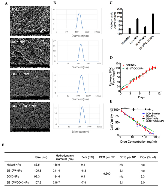 Figure 2: Characteristics of nanoparticles. A. Morphology of nanoparticles used in this study as captured by SEM. B, C. Hydrodynamic diameters of nanoparticles as determined by DLS. D. Controlled DOX release profiles of DOX-NPs and 3E10EN/DOX-NPs. E. Effects of nanoparticles on the viability of 4T1 murine breast cancer cells. The cells were treated for three days with DOX alone, DOX-NPs, 3E10EN-NPs, or 3E10EN/DOX-NPs and then survival was evaluated by MTT assay. Percent cell viability is shown. F. Summary of the major characteristics of the nanoparticles used in this study.