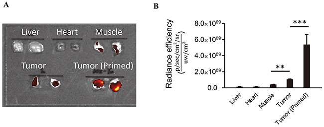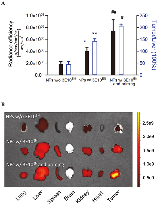 Figure 5: 3E10EN mediates autocatalytic, tumor-targeted delivery of nanoparticles. IR780-loaded nanoparticles with or without 3E10EN conjugation were administered intravenously to 4T1 tumor-bearing mice. Twenty-four hours later, tumors were excised and imaged using an IVIS imaging system. Naked NPs were observed to localize into a range of tissues. By contrast, 3E10EN-conjugated NPs showed a pattern of preferential uptake into tumors and a 2.3 fold increase in tumor localization compared to naked NPs. In addition, priming treatments with 3E10EN/DOX-NPs significantly enhanced tumor delivery of the nanoparticles. The average amount of nanoparticles in tumors from mice that received priming treatments was 1.8 times greater than the amount in tumors from mice without priming. With priming, the accumulation of nanoparticles in tumors was 4.1 times higher than that in the liver, compared to 0.5 times for mice that received treatment with naked NPs. Quantitative analysis of the accumulation of indicated nanoparticles in tumors (n=4) is shown in A. * and # represent statistical analyses between the NPs w/ 3E10EN group and the NPs w/o 3E10EN group, and between the NPs w/ 3E10EN and priming group and the NPs w/ 3E10EN group, respectively. * and #: P < 0.05, ** and ##: P < 0.01. Representative IVIS images of the bio-distribution of nanoparticles are shown in B.