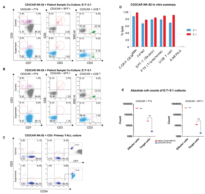 Flow cytometry analysis of SPT-1 (Sézary Syndrome, a classified PTCL) and PT4 (unclassified PTCL) patient samples reveal strong and consistent CD3 expression in population subsets (data not shown). In 24 hour co-culture, CD3CAR NK-92 cells lysed 80% of SPT-1 leukemic cells at a low E:T ratio of 2:1 (Figure 3A). 24 hour co-culture of CD3CAR NK-92 cells with PT4 resulted in >80% ablation of CD3+CD7- malignant cells at a low E:T ratio of 2:1 (Figure 3A). At an E:T ratio of 2:1, CD3CAR NK-92 cells also ablated 70% of GFP-transduced normal T cells derived from umbilical cord blood (UCB-T) (Figure 3A). Notably, at an E:T ratio of 5:1, CD3CAR NK-92 fully ablated target SPT-1 and PT4 patient samples (Figure 3B). To further investigate the specificity of the CD3CAR NK-92 cells in targeting primary leukemia patient samples, we considered a T-ALL patient sample expressing only a small subset of CD3+ T-cells, with a predominantly CD34+ CD3- tumor burden (Figure 3C). The CD3CAR NK-92 cells lysed over 50% of CD3+ T-cells at an E:T ratio of 5:1, with no change observed in the CD34+ CD3- tumor population (Figure 3C). Similar to above, we extrapolated absolute cell counts to analyze specific cultures and observe significantly lower target cell counts in cultures with CD3CAR NK-92 treatment due to tumorlysis (Figure 3E). Overall, at a low E:T ratio of 2:1, CD3CAR NK cells show significant CD3-specific ablation in patients with heterogeneous CD3+ T cell malignancies and T-ALL cell lines, with near 100% lysis of target cells at an increased E:T ratio of 5:1 (Figure 3D).