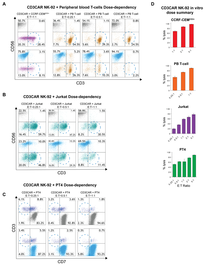 Figure 4: CD3NK-CAR NK-92 dose-dependent lysis of malignant cells. A. Flow cytometry schemes showing dose-dependent CD3CAR NK-92 co-cultures with CCRF-CEMCD3+ and peripheral blood derived (PB) T-cells. E:T ratios were decreased to a lower bound of 0.25:1 (25,000 effector cells to 100,000 target cells) and encircled populations represent lysis effects of interest. Co-cultures were conducted over 24 hours. B. Dose-dependent flow analysis of CD3CAR NK-92 cells with Jurkat cell line. Co-cultures were conducted for 6 hours and populations analyzed. C. Dose-dependent co-cultures of CD3CAR NK-92 cells with PT4 (unclassified PTCL) primary patient samples obtained from bone-marrow aspirate. D. Bar graphs summarizing the dosage relationships between CD3CAR NK-92 dose and target cell depletion. Bars represent the average of duplicate samples with CCRF-CEMCD3+ (N = 4), Jurkat (N = 4), PB T-cell (N = 2), and PT4 (N = 4).