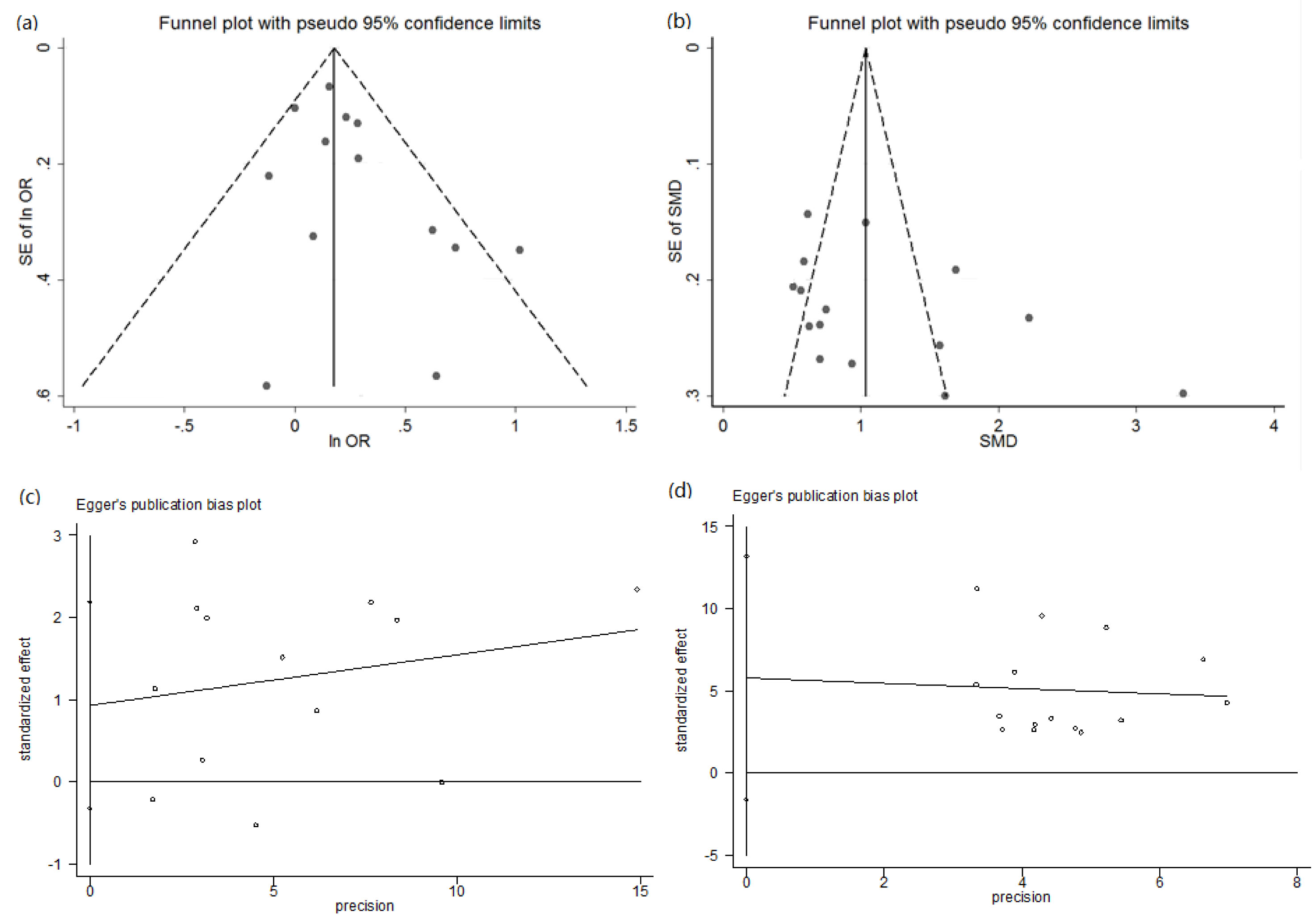 Figure 4: The funnel plots and Egger’s bias plot of publication bias in pooling ORs analysis (a and c) and pooling SMD analysis of retrospective studies (b and d).