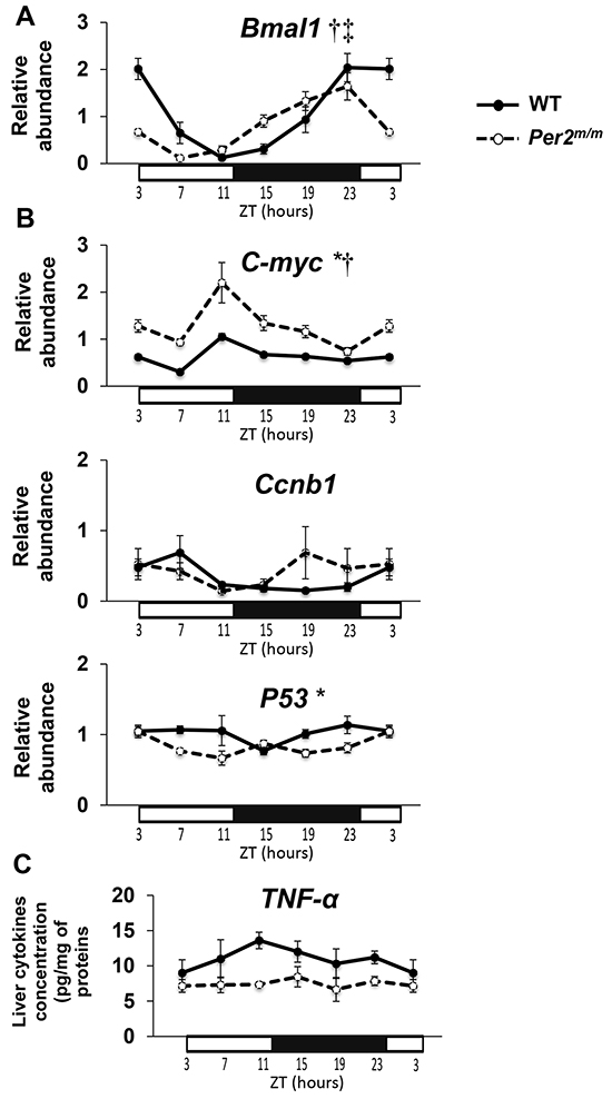 Figure 1: Moderation of selected liver clock, proliferation, genomic instability and pro-inflammatory cytokine patterns by Per2 loss-of-function. Each data point is mean of 5 mice at each of 6 Zeitgeber Times (ZT) for WT (dark circles) or Per2m/m mice (open circles). Circadian changes in mean ± SEM of mRNA expression for A. clock gene Bmal1; B. proliferation and genomic instability genes c-Myc, Ccnb1, and P53; C. TNF-α protein concentration in liver. Results from 2-way ANOVA: * p(genotype)≤ 0.01; † p(ZT)≤ 0.01; ‡ p(interaction)≤ 0.01.