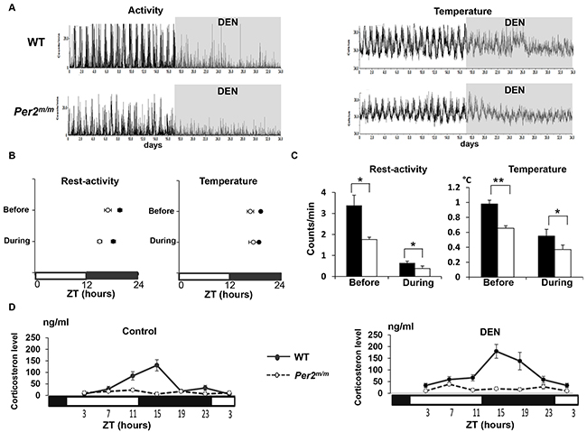 Plasma corticosterone was rhythmic in WT mice (Cosinor, p< 0.001), but not in Per2m/m both in untreated controls and in mice exposed to DEN, with 4.3-fold lower 24-h mean corticosterone levels in treated Per2m/m as compared to WT (p< 0.001) (Figure 3D).