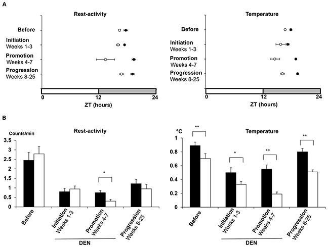 Mice underwent i.p. implantation of a telemetry sensor and radiotransmitter under isoflurane anesthesia 2 weeks before starting effective recording of locomotor activity and body temperature every 10 min (Physio Tel, TA 10 TA-F20, Data Sciences, St. Paul, Minnesota) (39). For Exp II, mice were monitored for 17 days before DEN treatment onset, and during the 17-day carcinogenesis initiation stage. For Exp III, body temperature and rest-activity were recorded for 5 days before DEN administration and until completion of experiment, i.e. 178 days after DEN exposure onset.
