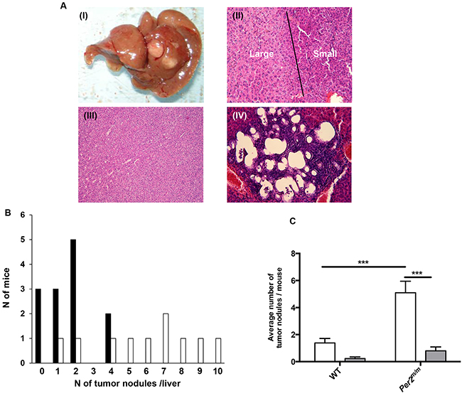 Figure 7: DEN-induced liver alterations according to Per2 loss-of-function found on day 178. A. Typical macroscopic view of a deeply reorganized liver with cancer nodules arising in a Per2m/m mouse (I); Typical microscopic view of large (left) or small (right) cell dysplasia coexisting in the same liver sample of a Per2m/m mouse and separated by a dark marker line (II); Microscopic view of hepatocarcinoma (III), and cholangiocarcinoma (IV). B. Number of tumor nodules per mouse liver in WT (black boxes) and Per2m/m (open boxes). C. Average number of hepatocarcinomas (open box) or cholangiocarcinomas (dark box) in WT and Per2m/m mice. *** p< 0.001.