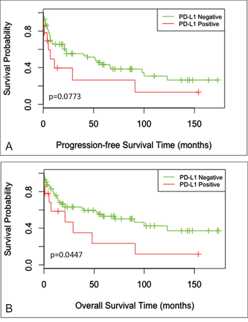 Figure 3: Survival curves for progression-free survival and overall survival. Kaplan-Meier curves for A. progression-free survival (PFS) time (P=0.0773) and B. overall survival (OS) time (P=0.0447) among PD-L1 positive and PD-L1 negative cases.