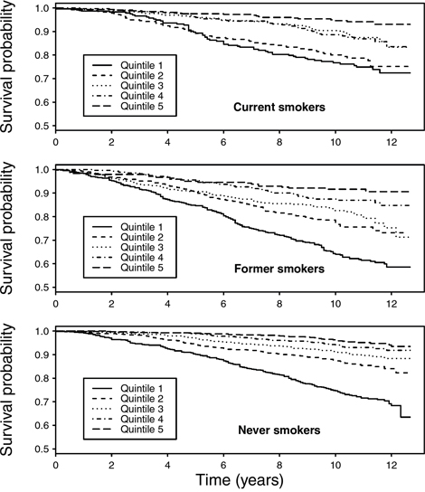 To gain further insight into associations between smoking exposures, telomere length and mortality, we displayed survival probability by LTL quintiles and smoking status using Kaplan-Meier curves. We further estimated hazard ratios (HRs) and 95% confidence intervals (CIs) of all-cause mortality by continuous values and quintiles of LTL for self-reported current, former, and never smokers. All models were adjusted for age, sex, race/ethnicity, PIR, education, BMI, vigorous physical activity and alcohol consumption. Analyses were repeated with cotinine-confirmed smoking status, and additional adjustment for pack-year of smoking was performed for current smokers. Due to the insufficient number of cases, we were unable to perform analyses by specific causes of death or characteristics of smoking exposures.