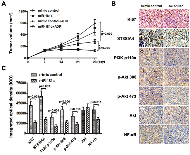 Figure 7: MiR-181c sensitizes K562/ADR cells to chemotherapeutic drugs in vivo. A. Tumor volumes of tumors in the mimic control, mimic control + ADR, miR-181c and miR-181c+ADR groups were measured on indicated days. Data presented are the mean ± SD B, C. Expression levels of Ki67, ST8SIA4 and PI3K/Akt signaling molecules in K562/ADR-mimic control group and K562/ADR-miR-181c group were analyzed by immunohistochemistry (*p<0.05).