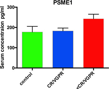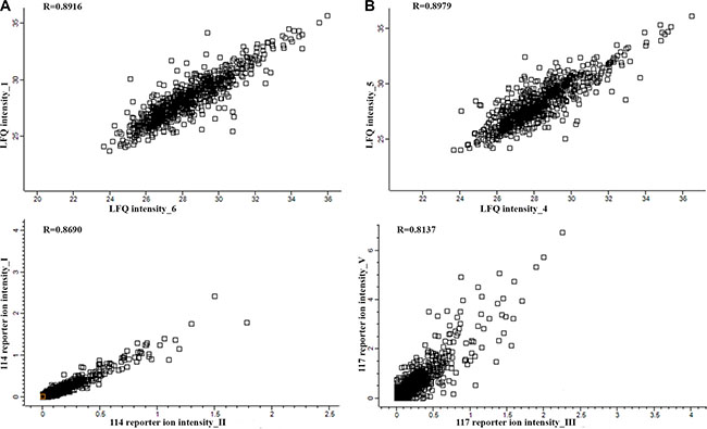 PC proteins were collected from 77 patients, digested with trypsin, and analyzed using label-free (LF) and isobaric Tags for Relative and Absolute Quantitation (iTRAQ)-based approaches. In each approach, 77 samples were prepared for digestion in duplicate. Then, each prepared sample was injected into the liquid chromatography (LC) system in duplicate in a random order. iTRAQ tag-labeled samples were analyzed using two different systems—LC matrix-assisted laser desorption/ionization tandem mass spectrometry (LC-MALDI-MS/MS) and LC electrospray ionization MS/MS (LC-ESI-MS/MS)—and the obtained data were compared. The reproducibility of the technical and biological replicates analyzed by LC-ESI-MS/MS was assessed by scatter plotting, and the correlation coefficient was determined based on the LF quantification (LFQ) intensities or iTRAQ reporter ion intensities for both experimental groups. Typical scatter plots comparing the LFQ intensities and iTRAQ reporter ion intensities are presented in Figure 1 and exhibit very good correlation among the biological replicates. Correlation analysis of the LFQ signal intensities among all biological replications gave Pearson coefficients between 0.76 and 0.96 (0.87 ± 0.09 for the CR/VGPR group; 0.81 ± 0.1 for the Figure 1: Representative correlation plots comparing the LFQ intensities and iTRAQ reporter ion intensities of two biological replications for the CR/VGPR (A) and < VGPR (B) groups. The Pearson correlation coefficient is provided for each plot. The data derived from the LF approach were analyzed using MaxQuant (MQ) [4, 5] software. As a result, 2915 proteins were identified with a false discovery rate of 1% (FDR). Among these proteins, 2204 proteins were identified with a minimum of 2 peptides. iTRAQ data were analyzed using MQ (LC-ESI-MS/MS data) and ProteinScape (PS) (LC-MALDI-MS/MS data). In total, 2664 and 1349 proteins were identified with one peptide, and 1389 and 753 were identified with a minimum of 2 labeled peptides and 1% FDR using MQ and PS, respectively. A protein was considered to be differentially expressed if the difference was statistically significant (p < 0.05) and the minimum fold change was ± 1.5. Only proteins identified with a minimum of 2 peptides were considered significant. Quantitative analysis in MQ identified 245 and 285 differential proteins derived from the LF and iTRAQ approach (LC-ESI-MS/MS data), respectively. Quantitative analysis performed in PS (LC-MALDI-MS/MS data) revealed 213 differentially expressed proteins. Only 118 proteins identified by all methods and software were considered as differentially expressed between two experimental groups; these proteins are presented in Supplementary Table S1. The results obtained for LF and both iTRAQ techniques are compared in Figure 2. Among the differentially expressed proteins, 35 proteins were down-regulated, and 83 proteins were up-regulated in samples from Figure 2: A Venn diagram comparing the results from the LF and iTRAQ (ESI and MALDI) techniques. The numbers indicate differential proteins identified with two peptides using each approach. We used the Database for Annotation, Visualization and Integrated Discovery (DAVID) [6] and Protein Analysis Through Evolutionary Relationships (PANTHER) [7, 8] tools to identify enriched functional gene ontology (GO) annotations in the 118 differentially expressed proteins. The data were classified based on their respective molecular functions, biological processes and physiological pathways. Our analysis revealed that more than half of the proteins that were differentially expressed in CR/VGPR and < VGPR patients could be classified into four classes according to GO annotations: proteins involved in proteasome function and related to protein folding and the endoplasmic reticulum (ER) unfolded protein response (UPR) (16 proteins); proteins involved in the response to oxidative stress and cell redox homeostasis (14 proteins); proteins regulating apoptotic process and programmed cell death (21 proteins); and inflammatory and defense response proteins (16 proteins) (Table 1). Some proteins were assigned to more than one class. Table 1: Comparison of the abundances of four protein classes overrepresented among differentially expressed proteins in CR/VGPR and < VGPR patients Gene Protein name Fold change < VGPR vs CR/VGPR P value Proteasome, protein folding and ER UPR PSME1 Proteasome activator complex subunit 1 3.89 1.39E-04 PSME2 Proteasome activator complex subunit 2 2.42 4.31E-02 PSMA5 Proteasome subunit alpha type-5 1.96 1.85E-02 PSMA7 Proteasome subunit alpha type-7 2.03 1.28E-02 PSMB8 Proteasome subunit beta type-8 2.08 1.83E-02 PSMB2 Proteasome subunit beta type-2 1.92 1.99E-02 PSMD1 26S proteasome non-ATPase regulatory subunit 1 2.55 4.78E-02 PSMD11 26S proteasome non-ATPase regulatory subunit 11 2.23 1.83E-02 HSPA9 Stress-70 protein, mitochondrial 3.06 1.37E-05 STIP1 Stress-induced-phosphoprotein 1 1.89 4.47E-02 NPM1 Nucleophosmin 1.75 4.05E-03 GANAB Neutral alpha-glucosidase AB 2.18 6.45E-04 HSPA6 Heat shock 70 kDa protein 2.56 3.92E-02 CACYBP Calcyclin-binding protein 3.23 3.50E-02 PDIA6 Protein disulfide-isomerase A6 2.04 4.16E-03 HSP90AB1 Heat shock protein HSP 90-beta 1.53 1.29E-02 Response to oxidative stress and cell redox homeostasis TXN Thioredoxin 2.91 5.92E-03 TXNDC5 Thioredoxin domain-containing protein 5 1.74 4.31E-02 PRDX3 Thioredoxin-dependent peroxide reductase 1.77 6.24E-03 TXNL1 Thioredoxin-like protein 1 2.82 4.59E-02 MPO Myeloperoxidase 0.15 2.40E-05 PRDX2 Peroxiredoxin-2 1.60 1.99E-02 PRDX5 Peroxiredoxin-5 2.22 3.11E-05 PRDX6 Peroxiredoxin-6 1.61 4.91E-02 CAT Catalase 0.31 4.72E-07 APEX1 DNA-(apurinic or apyrimidinic site) lyase 2.93 4.32E-02 GSTP1 Glutathione S-transferase P 0.53 9.68E-03 GLO1 Lactoylglutathione lyase 2.73 4.27E-02 NONO Non-POU domain-containing octamer-binding protein 2.21 5.28E-03 S100A9 Protein S100-A9 0.33 8.35E-04 Regulation of apoptotic process and programmed cell d