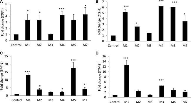 BMI-1 was found to be highly expressed compared to control in M1 (13.2 fold), M5 (17.5 fold), and to a lesser extent in M7 (4.3 fold), and only 2.3–3.5 fold increase in M2, M3, and M4 groups (Figure 1C). The high expression of BMI-1 in M1, M5, and M7 groups was confirmed by Western blot technique (data not shown).