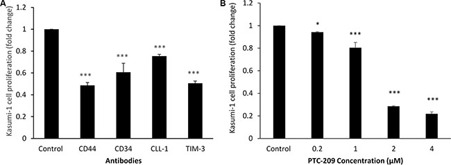 Figure 3: Kasumi-1 cell line proliferation with antibodies against CD44, CD34, CLL-1, TIM-3 or BMI-1 small molecular inhibitor PTC-209, measured with MTT assay. (A) Anti-CD44 (1.0 μg/100 μl), anti-CD34 (1.0 μg/100 μl), anti-CLL-1 (0.5 μg/100 μl), and anti-TIM-3 (0.5 μg/100 μl). (B) PTC-209 at concentrations ranging from 0.2 to 4 μM. Fold changes in cell proliferation are expressed as mean ± S.D., n = 3. One-way ANOVA was used followed by the Newman-Keuls post-test (***p < 0.001, **p < 0.05).