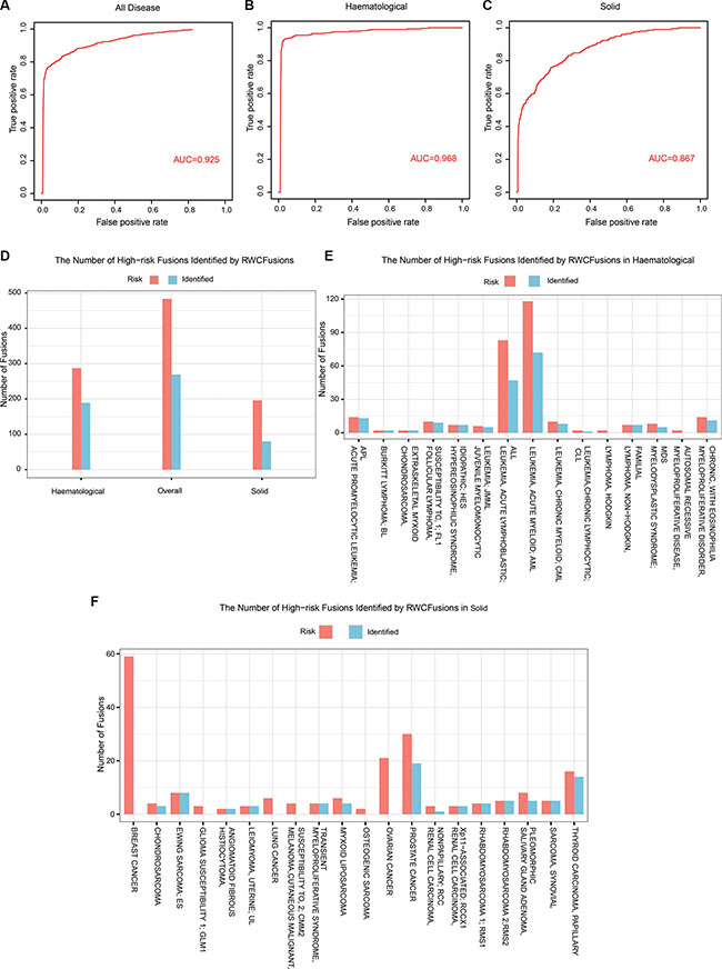 Figure 1: The performance of RWCFusion evaluated by leave-one-out cross validation. (A, B and C) showed the AUC results for overall cancers, haematological and solid classes respectively based on leave-one-out cross validation. (D, E and F) showed the number of priviously known high-risk gene fusions identified by RWCFusion.