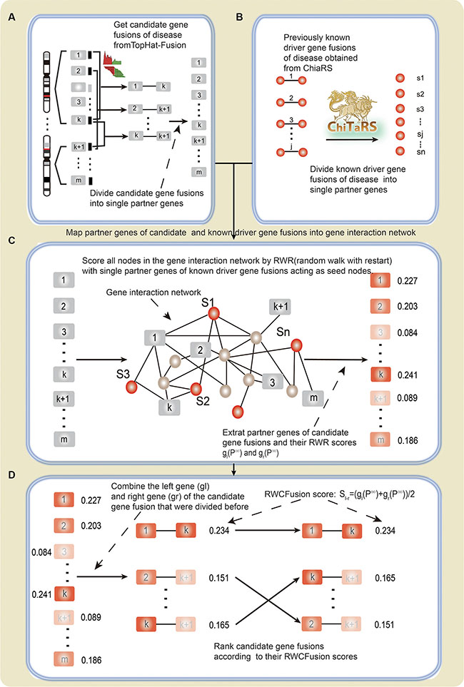 We developed RWCFusion method to identify cancer driver gene fusions in different cancers from candidates according to their global functional similarity with high-risk cancer gene fusions in the gene interaction network (Figure 4A–4D).