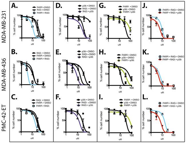 Figure 1: Combination of RAD51, PARP and p38 inhibitors against TNBC cell lines. The three TNBC cell lines MDA-MB-231 (top row), MDA-MB-436 (middle row) and PMC42-ET (bottom row) were used for dose response studies using three molecular inhibitors targeting RAD51 (B02, RAD51i), PARP (ABT-888, PARPi) and p38 (LY2228820, p38i). Dose curves for the single drugs were performed using 0-100 μM escalating doses. The combinations were carried out as follows: A–C. RAD51i escalating doses 0-100 μM with 2.5 μM of PARPi; D–F. RAD51i escalating doses 0-100 μM with 10 μM of p38i; G–I. p38i escalating doses 0-100 μM with 2.5 μM of PARPi J–L. RAD51i escalating doses 0-100 μM with 2.5 μM PARPi alone or with 10 μM of p38i. All experiments were performed over 72 hours in triplicate and graphs represent line of best-fit non-linear regression +/-SEM.
