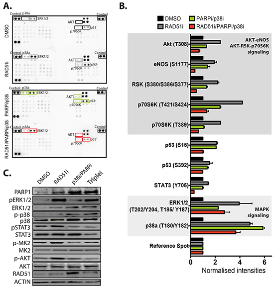 Figure 2: Targeting of RAD51 activates several signaling pathways but attenuated by combining with PARP and p38 inhibition. A. The Human Phospho-Kinase arrays (R&D Systems) were probed with MDA-MB-231 lysate samples that had been treated for 72 hours; samples used are labeled (from top to bottom): (1) DMSO treatment, (2) 10 μM RAD51i, (3) 2.5 μM PARPi/10 μM p38i, and (4) 10 μM RAD51i /2.5 μM PARPi/10 μM p38i triple combination. Highlighted dots represent a significant change in signal over DMSO treated controls. The corners are positive control blots for quantification. B. Quantitation of spot intensity was standardized for cells treated with DMSO and plotted as normalized intensity. Several kinases displayed greater than 2 fold increase in phosphorylation compared to references. Shading represents grouping based on pathway signaling. C. Protein expression and changes in phosphorylation of ERK1/2, p38, STAT3, MK-2 (p38 target) and AKT were confirmed by western blotting.