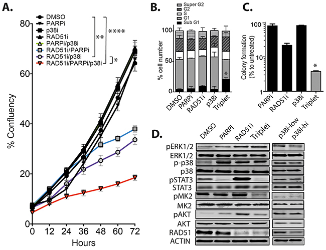 Figure 3: The combination of RAD51/PARP/p38 inhibition retards TNBC growth in vitro. A. MDA-MB-231 cells were incubated in the presence of single, dual or triple drug combinations using 10 μM RAD51i, 10 μM p38i and 2.5 μM PARPi and cell growth followed over 72 hours. Results are average percentage confluency of the well (*p<0.05, **p<0.01, ****p<0.001). B. Cell cycle analysis of MDA-MB-231 cells treated with each inhibitor individually and in combination *p<0.05. C. Long term 14-day colony assays were performed on treated MDA-MB-231 and expressed as percentage of DMSO treated cells *p<0.05. D. Expression of key signaling proteins were examined after single drug treatment or the triple combination, p38i was utilized at low concentration of 10 μM as used in the combination therapies and at 100 μM high dose to observe any changes in expression.