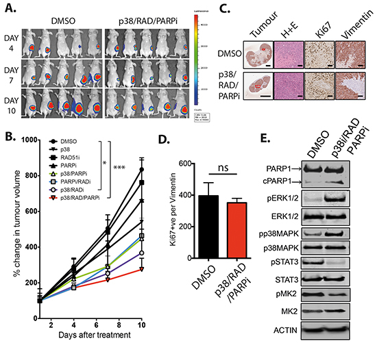 Figure 4: RAD51, PARP and p38 combined inhibition in vivo. A. MDA-MB-231 xenografts were monitored by bioluminescence (luciferin) imaging, DMSO and triple therapy cohorts are represented. B. Tumor burden plotted as percentage change in volume for all single arm controls, double combinations and triple therapy combination compared to days after treatment with all three drugs. *p<0.05, ***p<0.005. C. Histological analysis for overall size, cellularity, proliferation and vimentin expression of DMSO and triple treated tumors (Scale bar =100 μm). D. Quantification of human proliferating cells (Ki67+, Vimentin+). E. Protein expression and signaling analysis of day 10 ex vivo DMSO and triple combination treated tumors.