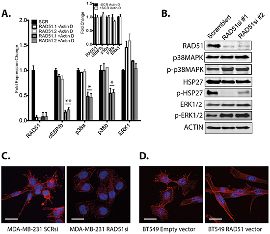 Figure 5: Analysis of p38 pathway signaling. A. MDA-MB-231 cells were depleted of RAD51 and analyzed for expression of the specified genes in the presence or absence of the transcriptional inhibitor actinomycin D. Plots represent the fold expression change over GAPDH and are the average of triplicate experiments +/-SEM. (A-Insert) Controls for non-targeting siRNA +/- actinomycin D. B. Expression of the specified proteins and phosphoproteins examined after RAD51 depletion with two different siRNA. C. Immunofluorescence of MDA-MB-231 cells depleted of RAD51 and stained for morphology. D. Immunofluorescence of BT549 cells engineered for RAD51 overexpression and stained for morphology (Scale bar =100 μm).