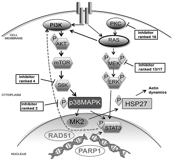 Figure 6: Schematic of p38 pathway signaling. The schematic shows the signaling cascade from a receptor tyrosine kinase to the nucleus. We have highlighted some of the key proteins that were directly inhibited by small molecules and where they ranked in order of efficacy with RAD51 depletion. Due to a K-RAS mutation in MDA-MB-231 cells PI3K is highly active, however RAD51 depletion resulted in ERK1/2 activation. This is why the PKC and MEK were lowly ranked targets compared to S6K and p38 (Ranking obtained from Table 1). We suggest that the ability of RAD51 to bind c/EBPβ can increase expression of key components of the signaling pathway. This is supported by the observation of RAD51-mediated changes in actin dynamics via p38 signaling to HSP27.