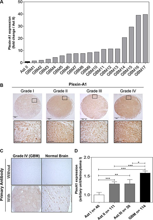 Figure 1: PlexA1 expression correlates with glioma severity. (A) Q-RTPCR analysis of PlexA1 expression in 17 GBM biopsies compared to a low grade astrocytoma (grade II). (B) Tissue array analysis. Insets show higher magnification of each picture (scale bar: 40 μm). (C) Quality control experiments verifying the specificity of the signal in a GBM and a normal brain sample with (positive control) or without primary antibody (negative control). (D) Quantification of PlexA1 expression level according to the grade of the tumor, Ast I = Astrocytoma grade I, Ast II = Astrocytoma grade II, Astrocytoma grade III, GBM = Glioblastoma.