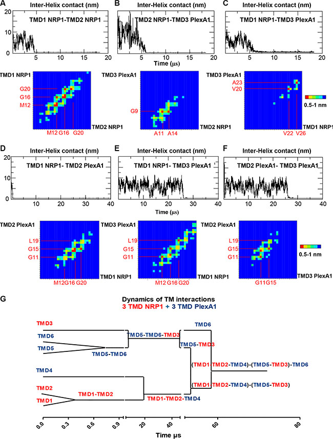 Figure 2: Dynamic of PlexA1 TMD interactions. The graphs represent the inter helix distance between two monomers as a function of time. Contact maps exhibit the residue pairs (key interfacing residues) having the smallest distances between two helices backbones. The red squares correspond to the closest distances 0.5 nm < d < 0.6 nm and the blue squares correspond to the longest distances (d > 1 nm). The yellow, green and light blue squares correspond to intermediate distances 0.6 < d < 0.7, 0.8, 0.9 nm). (A–F) CG simulation including different compositions of NRP1 and PlexA1 TMDs. (G) Dynamics of the interactions between 3 NRP1 TMDs and 3 PlexA1 TMDs inserted in DOPC bilayer along a 72 μs simulation.