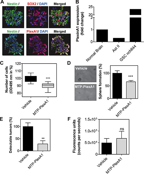 Figure 7: MTP-PlexinA1 inhibits cancer stem cells-dependent tumor growth. (A) Expression of Nestin (green), Sox2 (red) in NCH644 glioma stem cells. PlexA1 receptor (red) is expressed in Nestin positive cells (green) (scale bar 100 μm). (B) Q-RTPCR analysis showing the expression of PlexA1 in normal brain, Astrocytoma II (Ast II) and NCH644. MTS proliferation assay (C) and sphere formation assay (D). (E) Detectable tumors (%) after in vivo grafting. (F) Fluorescence signal produced by tumors that were able to grow over the five days period in the vehicle treated cells (black bar) and MTP-PlexA1 treated cells (grey bar).