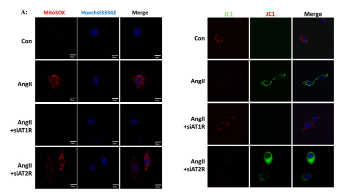 Figure 3: Ang II induced mitochondrial dysfunction and mROS overproduction in vitro. A: Confocal microscopy analysis of mitochondria-generated ROS by MitoSOX staining in living HK-2 cells pre-treated with siAT1R or siAT2R before Ang II stimulation. B: Confocal microscopy analysis of mitochondrial transmembrane potential (MMP) by JC-1 staining in living HK-2 cells pre-treated with siAT1R or siAT2R before Ang II stimulation.