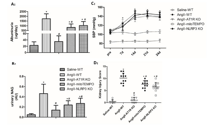 To further test the effect of Ang II on the initiation and progression of renal injury, different types of uninephrectomized mice were infused with Ang II, and WT mice infused with saline were taken as the control group. After 4 weeks of Ang II infusion, urinary levels of albumin and N-acetyl-β-D-glucosaminidase (NAG) were increased in WT, mitoTEMPO-treated and NLRP3 KO mice compared to the WT controls (Figure 5A-B). However, Ang II-infused mitoTEMPO-treated and NLRP3 KO mice showed much lower albuminuria and NAG levels than Ang II-infused WT mice. In addition, both albuminuria and NAG levels were significantly reduced in AT1R KO mice (Figure 5A-B). Following chronic infusion of Ang II for 4 weeks, the blood pressure (SBP) was measured by the tail-cuff method. We found that Ang II induced significant and similar increase of SBP in mitoTEMPO-treated and NLRP3 KO mice compared to the WT controls, demonstrating the hypertension-independent protection of mitoTEMPO and NLRP3 deletion (Figure 5C). However, Ang II-infused AT1R KO mice showed much lower blood pressure levels than the WT controls, indicating the important role of AT1Rs in blood pressure maintenance ( Figure 5D).