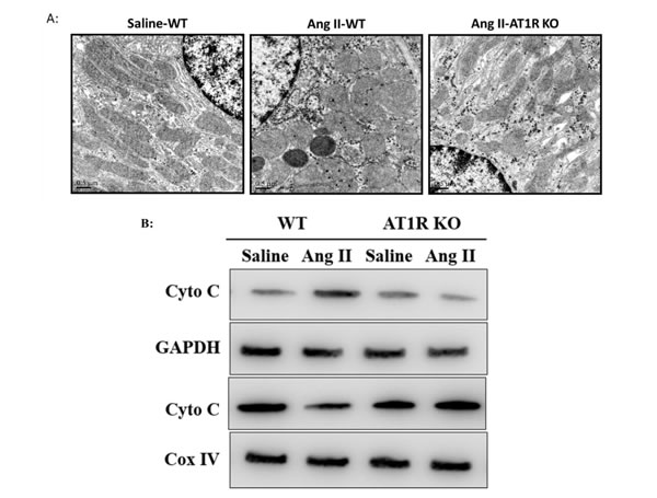 Figure 7: AT1R deletion attenuated Ang II-induced mitochondrial dysfunction in vivo. A: The ultrastructure of tubular epithelial cells in saline-treated and Ang II-infused mice was observed by TEM. B: Western Blot analysis of the release of cytochrome c from mitochondria to cytoplasm.