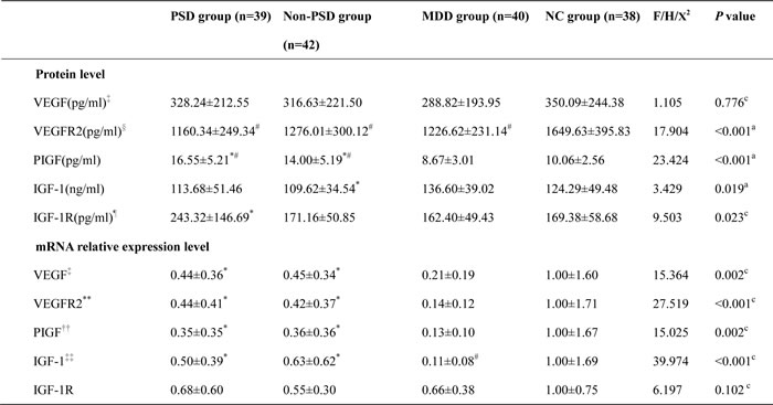 Note: a one-way ANCOVA, gender and age as covariant. c Kruskal-Wallis test. # P < 0.05 compared with HC group. *P < 0.05 compared with MDD group. ‡ two abnormal data were excluded (one PSD and one MDD patients on protein level, one Non-PSD and one MDD patients on mRNA level); § one abnormal data in MDD group were excluded; ¶ six abnormal data were excluded (one PSD patients, two Non-PSD patients, one MDD patients, two NC subject); **four abnormal data were excluded (one outlier in each group); ††three abnormal data were excluded (one outlier in PSD, Non-PSD and MDD respectively); ‡‡ eleven abnormal data were excluded (three PSD patients, two Non-PSD patients, four MDD patients, two NC subject).