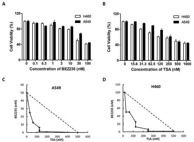 Figure 1: Combination treatment with BEZ235 followed by TSA leads to synergistic cytotoxic effect on A549 and H460 cells. A-B. A549 and H460 cells were treated with the indicated concentrations of BEZ235 or TSA for 24 h. Viable cells were measured using the MTT assays. C-D. Isobologram analyses were performed, and CI values were calculated. CI values less than 1.0 indicate the synergistic interaction of the two agents in the combination.