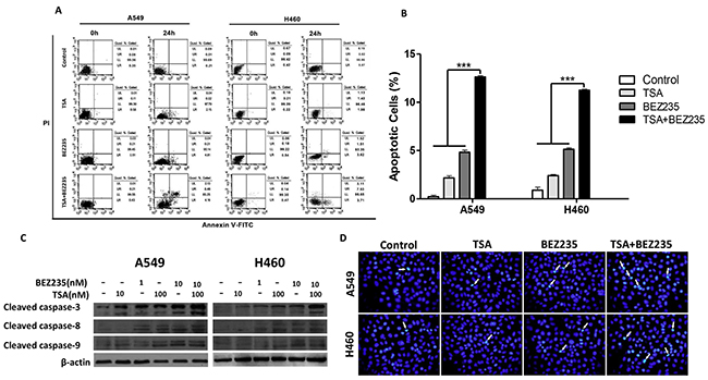Figure 2: Combination treatment with BEZ235 followed by TSA induces apoptosis in A549 and H460 cells. A-B. A549 and H460 cells were exposed to the indicated concentration of BEZ235 and/or TSA for 24 h, and the cells were stained with Annexin V-FITC/PI. Apoptotic cells were analyzed by flow cytometry.(***p<0.001). C. Protein levels of cleaved caspase-3, -8 and -9 were determined by western blot. D. Cells were stained with Hoechst33342 and analyzed by fluorescence microscopy. Arrow point identifies apoptotic nuclei.