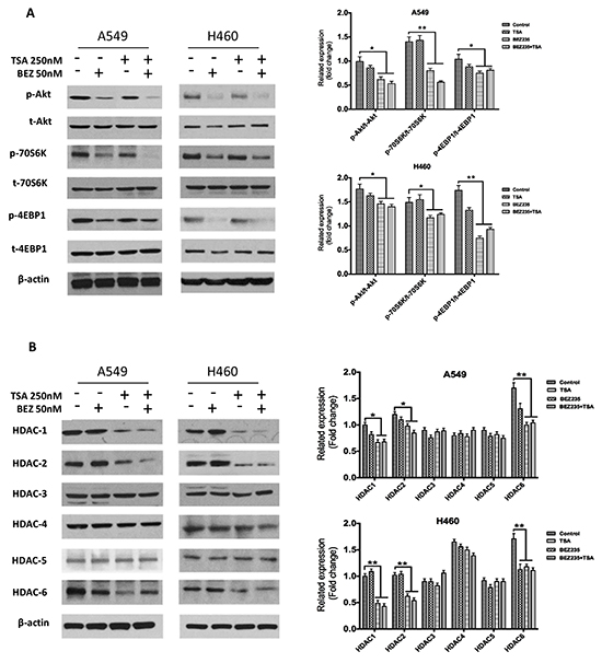 Figure 3: BEZ235 suppresses p-Akt, p-70S6K, and p-4EBP1, whereas TSA mainly suppresses HDAC1/2/6 in A549 and H460 cells. A549 and H460 cells were treated with the indicated concentrations of BEZ235 and/or TSA for 24h. Total cell lysates were subsequently prepared, and western blot analyses were performed for t-Akt, p-Akt (Ser473), t-70S6K, p-70S6K (Thr389), t-4EBP1, p-4EBP1 (Thr37/46), HDAC1, HDAC2, HDAC3, HDAC4, HDAC5 and HDAC6. The β-actin expression level in the lysates served as the loading control.(*p<0.05, **p<0.01).
