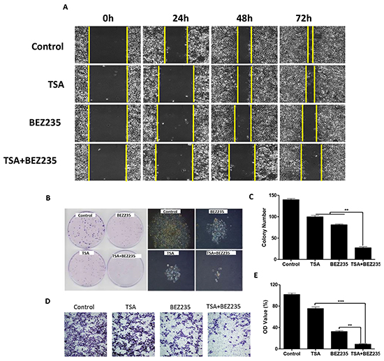 Figure 4: Co-treatment with BEZ235 and TSA synergistically inhibited A549 cancer cell proliferation, migration and invasion. A. A549 cancer cells were treated with the indicated concentrations of BEZ235 and/or TSA for 24 h. Photographs were taken at 0h, 24h, 48h and 72h, after the wound was made. The normalized wound area was calculated using a software-base method. B-C. A549 cells were seeded, and then treated with the indicated concentrations of BEZ235 and/or TSA for 24h, and morphological changes were visualized by phase-contrast microscopy. The cells were stained and the colonies were photographed. The number of colonies was determined by microscope. D-E. A549 cells were seeded and treated with the indicated concentrations of BEZ235 and/or TSA for 24h, and the number of invasive cells was determined using a transwell matrix penetration assay (with matrigel).(**p<0.01, ***p<0.001).
