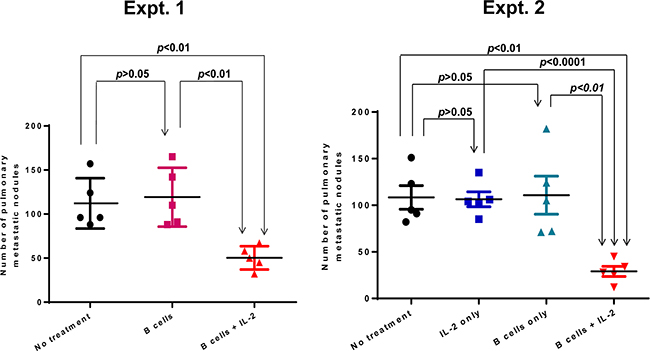 Although interleukin-2 was originally described as a “T cell growth factor”, we have found that it can significantly enhance the antitumor immunity of the B effector cells in adoptive therapy. In order to investigate the role of IL-2 in B cell-mediated adoptive immunotherapy, we examined the efficacy of transferred TDLN B cells given in a suboptimal dose (1 × 106 cells/mouse) in conjunction with or without IL-2 administration. Fourteen days after 4T1 tumor cells were injected into the mammary fat pad, mice were administered with activated TDLN B cells alone or TDLN B cells plus IL-2. Fourteen days later, mice were euthanized to quantify pulmonary metastases. A suboptimal dose of B cells alone showed no efficacy, but B cells plus IL-2 administration i.p. significantly inhibited the induction of spontaneous pulmonary metastases (Figure 1, Expt. 1). However, IL-2 alone had no therapeutic effect compared to PBS-treated controls (Figure 1 Expt. 2). These experiments indicated that exogenous IL-2 administration augmented the therapeutic efficacy of transferred effector B cells.