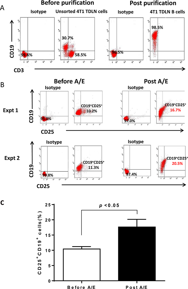 Figure 2: Phenotype of 4T1 TDLN B cells. A. The purity of 4T1 TDLN B cells. TDLN cells were double stained with anti-CD3 and anti-CD19 before and after CD19+ cell purification. B. Detection of IL-2R (CD25) on the cell surface of purified 4T1 TDLN B cells. B cells were double stained with anti-CD19 and anti-CD25 antibodies before and after B cell activation and expansion (A/E). Results are shown in two independent experiments performed. C. 4T1 TDLN B cell activation and expansion (A/E) significantly augmented IL-2R(CD25)-expressing B cells.