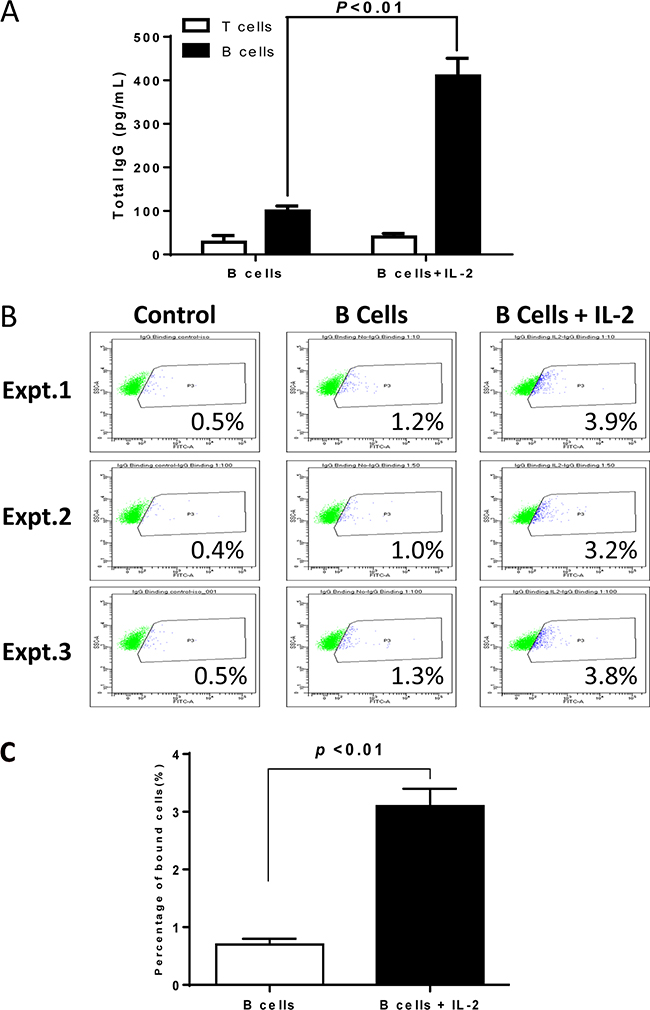 Figure 3: Humoral responses against 4T1 in the hosts subjected to 4T1 TDLN B cells + IL-2 therapy. A. IgG production by host T and B cells purified from the spleens of animals subjected to TDLN B cell therapy with vs. without IL-2. B. Flow cytometry showing the binding effect of IgG to 4T1 tumor cells. IgG are from the culture supernatants of spleen B cells as prepared in Figure 3A. Binding experiments were repeated 3 times. C. Binding to 4T1 cells by IgG from culture supernatants of spleen B cells harvested from the 4T1 bearing mice treated with 4T1 TDLN B cells alone or 4T1 TDLN B cells plus IL-2 administration.