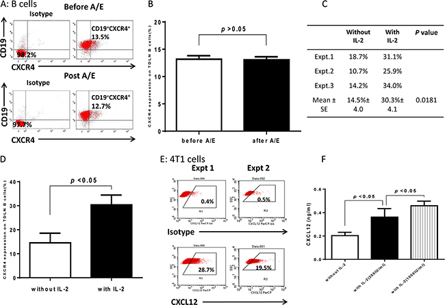 Figure 4: Expression of CXCR4 in 4T1 TDLN B cells and CXCL12 in 4T1 tumor cells. A. Purified 4T1 TDLN B cells express CXCR4. B cells were prepared as in Figure 2 and double stained with PE-anti-CD19 and FITC-anti-CXCR4 before and after activation/expansion (A/E) respectively. B. CXCR4 expression on 4T1 TDLN B cells before and after A/E without IL-2. C. Comparison of CXCR4 expression on 4T1 TDLN B cells with vs. without IL-2. D. IL-2 significantly increased expression of CXCR4 on 4T1 TDLN B cells. E. 4T1 tumor cells express CXCL12. Data from two independent experiments of flow cytometry assays are shown. F. IL-2 significantly augmented CXCL12 production by cultured 4T1 cells as detected in the culture supernatant using ELISA.