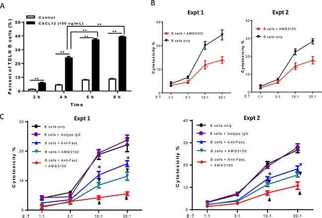 Figure 5: Involvement of CXCR4/CXCL12 pathway in 4T1 TDLN B cell-mediated cytotoxicity of 4T1 tumor cells. A. The chemotaxis of activated 4T1 TDLN B cells detected by transwell assay. 4T1 TDLN B cells were put in the upper chamber of the transwell, while CXCL12 was added to the lower chamber of the transwell. After incubation for 2, 4, 6, and 8 hours, cells in the lower chamber were enumerated using a hemocytometer. ** p<0.01. The chemotactic index (%) represents the ratio of cells migrating in the presence of chemokines to the number of cells migrating in the absence of cytokines at each time point analyzed in triplicate. Results are shown as mean±SEM of triplicate counts from a single experiment representative of three experiments performed. B. CXCR4 specific inhibitor, AMD3100 (2.5 μg/ml), blocked cytotoxicity of 4T1 tumor cells mediated by effector 4T1 TDLN B cells in the LDH assays. *p<0.05, B cells + AMD3100 vs. B cells only at the ratios of 10:1 and 30:1 in two experiments performed. (C) Additively blocked cytotoxicity of 4T1 tumor cells mediated by 4T1 TDLN B cells with anti- FasL and AMD3100. The B cells were co-cultured with 4T1 cells with or without the addition of AMD3100 (2.5 μg/ml) and/or anti-FasL (10 μg/ml) in the LDH assays. Anti-FasL mAb isotype- matching IgG was used as control. *p<0.05, B cells + anti-FasL vs. B cells only or vs. B cells + isotype IgG; ▼ p<0.05, B cells + AMD3100 vs. B cells only or vs. B cells + isotype IgG; ▲ p<0.05, B cells + anti-FasL + AMD3100 vs. B cells + anti-FasL or vs. B cells + AMD3100. Data are generated from two independent experiments as shown.