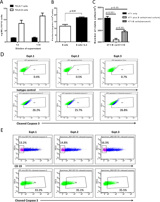 Figure 6: Perforin in 4T1 TDLN B cell-mediated cytotoxicity of 4T1 cells. A. TDLN B cells produce perforin. Supernatant was collected from cultured 4T1 TDLN T cells and B cells respectively, and was detected for perforin production by ELISA. The dilution of the supernatant was 1:2 and 1:10 as indicated. Results are shown as mean ± SEM of triplicate wells from a single experiment representative of three experiments performed. B. IL-2 significantly enhanced perforin production by 4T1 TDLN B cells as detected in the B cell culture supernatant using ELISA. C. The cytotoxity of activated 4T1 TDLN B cells against 4T1 cells was detected by mixed cells and in transwell respectively. The ratio of 4T1 cells : B cells was 1:10. The starting 4T1 cell number was 400, but was significantly (p<0.001) decreased in the mixed culture with 4T1 and B cell contact as well as in the transwell experiment without 4T1 and B cell contact (p<0.05). However, there was a significant (p<0.05) difference between these two groups: mixed-culture vs. transwell. D. In transwell assays, after 6 hours incubation, 4T1 cells in the lower chamber were fixed and permeabilizated, followed by staining with anti-mouse cleaved caspase-3 mAb. E. Cell-cell contact resulted in more 4T1 cells expressing cleaved caspase-3 than those in the transwell. In cell-cell contact assays, mixed B cells and 4T1 cells were harvested after incubation for 6 hours, surface stained with anti-CD19, and then fixed and permeabilizated, followed by staining with anti-mouse cleaved caspase-3 mAb. The 4T1 cells were gated from the CD19 negative population. Data of three experiments are shown.