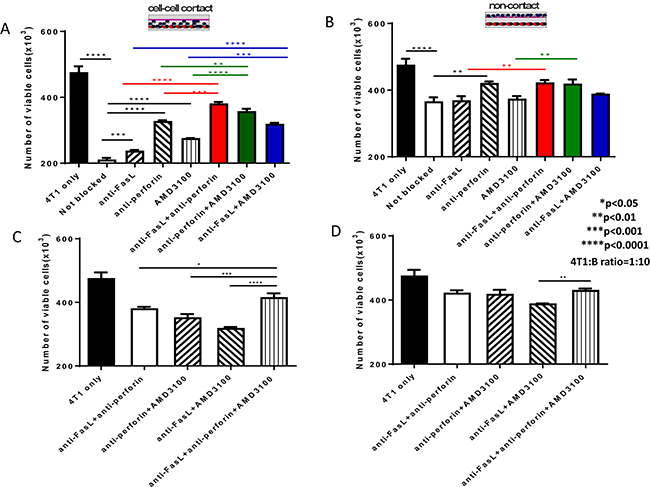 Figure 7: Cytotoxicity of 4T1 tumor cells mediated by 4T1 TDLN B cells involves Fas/FasL and CXCR4/CXCL12 pathways as well as perforin. A. B cell killing of 4T1 tumor cells in cell-cell contact in the presence of anti-FasL, anti-perforin and AMD3100 either by each itself or by any 2 of the 3 in combination. B. B cell killing of 4T1 tumor cells without cell contact in the presence of anti-FasL, anti-perforin and AMD3100 either by each itself or by any 2 of the 3 in combination. C. B cell killing of 4T1 tumor cells in cell-cell contact in the presence of anti- FasL+anti-perforin +AMD3100 compared with the use of any 2 of the 3 in combination. D. B cell killing of 4T1 tumor cells without cell contact in the presence of anti-FasL+anti-perforin +AMD3100 compared with the use of any 2 of the 3 in combination. Results are shown as mean±SEM of triplicate wells from a single experiment representative of three experiments performed.* p<0.05, ** P<0.01, *** P<0.001, **** P<0.0001.