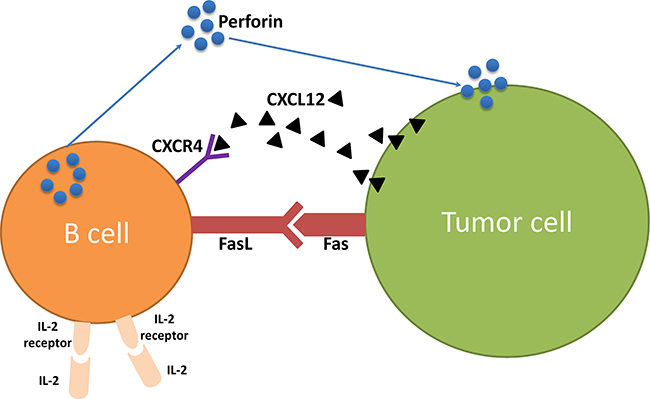 Interleukin 2 (IL-2) is a pleiotropic cytokine that stimulates T-cell proliferation; enhances NK cytolytic activity, induces the differentiation of Tregs, and causes activation- induced cell death [4, 5]. However, the effect of IL-2 on B lymphocytes is not well defined. In addition, CXCR4 is a chemokine receptor specific for stromal-derived-factor-1(SDF-1), and is also known as CXCL12, a molecule with strong chemoattractant properties for lymphocytes [6, 7]. Furthermore, a property of cytotoxic lymphocytes is their expression and release of powerful toxins, including the pore-forming protein perforin [8, 9]. While perforin is known to be a cytolytic protein found in the granules of cytotoxic T lymphocytes (CTLs) and natural killer cells [10, 11], its role in B cells is unknown. In this present study, we examined new mechanisms contributing to direct B cell-mediated antitumor immunity, including the impact of IL-2, the CXCR4/CXCL12 pathway and perforin in mediating tumor regression after the adoptive transfer of B effector cells.