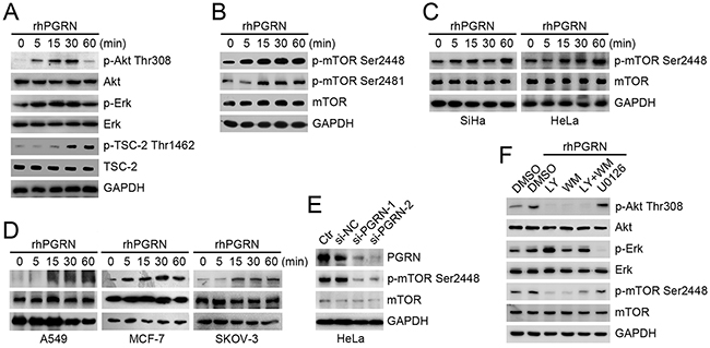 Figure 2: PGRN promoted phosphorylation of mTOR, which depended on PI3K/Akt signaling. Western blot assay of phospho-Akt-Thr308, phospho-Erk-Thr202/Tyr204 and phospho-TSC-2-Thr1462 A. and phospho-mTOR-Ser2448 and Ser2481 B. in H8 cells with 500 ng/mL rhPGRN treatment. Western blot assays of phospho-mTOR-Ser2448 in C. SiHa, HeLa, D. A549, MCF-7 and SKOV-3 cells with rhPGRN treatment. E. Level of phospho-mTOR at Ser2448 in HeLa cells transfected with negative control siRNA (si-NC) and PGRN siRNA (si-PGRN). Ctr was parent HeLa cells. F. Western blot assay of mTOR activation in cervical cells stimulated with rhPGRN alone or with inhibitors of PI3K/Akt or MEK/Erk signaling pathways. GAPDH was a loading control.