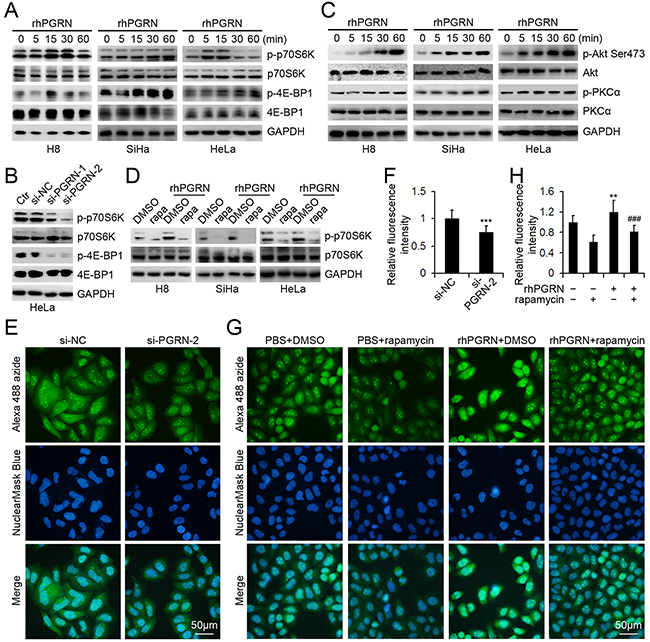 Figure 3: PGRN regulated the phosphorylation of mTORC1 and mTORC2 downstream molecules and mTORC1-mediated protein synthesis. A. Western blot assay of phospho-p70S6K-Thr389 and phospho-4E-BP1-Thr37/46 in cervical cells with 500 ng/mL rhPGRN treatment; B. phospho-p70S6K-Thr389 and phospho-4E-BP1-Thr37/46 in HeLa cells transfected with PGRN siRNA (si-PGRN) or control siRNA (si-CTR); C. phospho-Akt-Ser473 and phospho--PKCα-Thr638 in cervical cells with 500 ng/mL rhPGRN treatment; and D. mTORC1 activation in cervical cells stimulated with 500 ng/mL rhPGRN alone or with 100 μM rapamycin. GAPDH was a loading control. Representative micrographs E. and quantification of Alexa 488 fluorescence intensity F. of HeLa cells transfected with si-NC or si-PGRN-2 treated with O-propargyl-puromycin (OPP). Representative micrographs G. and quantification of Alexa 488 fluorescence intensity H. of HeLa cells treated with PBS or rhPGRN in the absence or presence of rapamycin followed by OPP treatment. Nuclei were revealed by HCS NuclearMaskBlue Staining. The relative fluorescence intensity was determined by setting the fluorescence intensity of HeLa cells transfected with si-NC or treated with PBS + DMSO to 1. Data are mean ± SD. **, P<0.01; ***, p<0.001 compared with HeLa cells transfected with si-NC or treated with PBS + DMSO. ###, p<0.001 compared with HeLa cells treated with rhPGRN + DMSO.