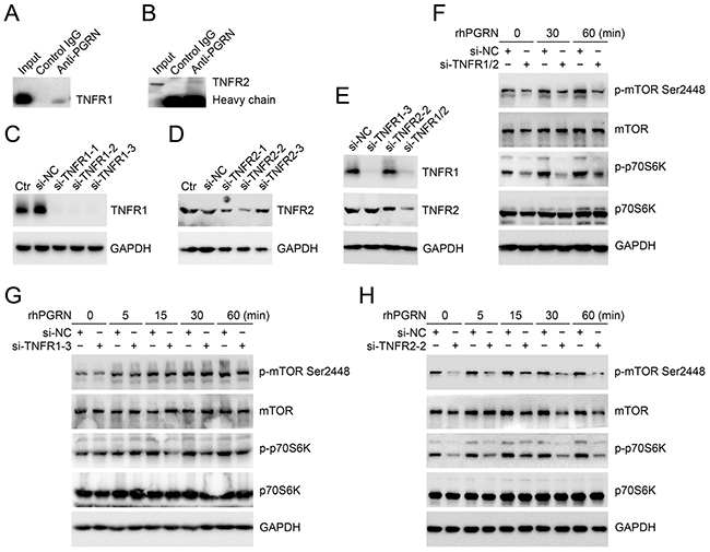 Tumor necrosis factor receptors (TNFRs) are potential binding receptors of PGRN. The binding of PGRN with TNFR1 and TNFR2 in HeLa cells was confirmed by Co-immunoprecipitation (Co-IP) assays (Figure 4A, 4B). To investigate whether TNFRs are needed for PGRN-mediated mTOR signaling, we detected the phosphorylation of mTOR and p70S6K in cervical cancer cells with reduced expression of TNFR1 or/and TNFR2 after rhPGRN treatment. The expression of TNFR1 or/and TNFR2 in HeLa cells was suppressed by transfection of si-TNFR1 or/and si-TNFR2 (Figure 4C–4E). As shown in Figure 4F, reduced expression of TNFR1 and TNFR2 impaired rhPGRN-stimulated phosphorylation of mTOR and p70S6K. Interestingly, reduced expression of TNFR2 but not TNFR1 in HeLa cells dramatically blocked rhPGRN-stimulated mTOR signaling (Figure 4G, 4H).