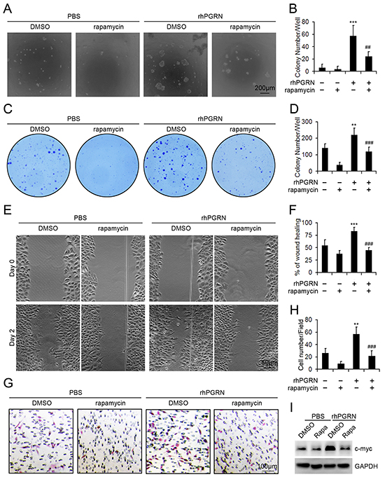 Figure 5: Rapamycin inhibited the transformation of H8 cells treated with rhPGRN. Representative micrographs A. and colony counting B. of colony formation assay in soft agar culture of H8 cells treated with PBS or 500 ng/mL rhPGRN in the presence or absence of 100 μM rapamycin. Representative photographs C. and colony counting D. of H8 cells in medium with 1% FBS treated with rhPGRN in the presence or absence of rapamycin. E. Wound healing assay of H8 cells treated with rhPGRN in the presence or absence of rapamycin. F. Percentage of wound healing. The normalized values were calibrated against the wound widths at day 0 that were arbitrarily set to 100%. G. Migration assay of H8 cells treated with rhPGRN in the presence or absence of rapamycin. H. Data analysis of migrated cells quantified by counting five fields under 20 × magnification. Data are mean ± SD. **, P<0.01; ***, p<0.001 compared with H8 cells treated with PBS + DMSO. ##, P<0.01; ###, p<0.001 compared with H8 cells treated with rhPGRN + DMSO. I. Western blot assay of c-myc in H8 cells treated with PBS or 500 ng/mL rhPGRN for 24 h after DMSO or 100 μM rapamycin pretreatment. GAPDH was a loading control.
