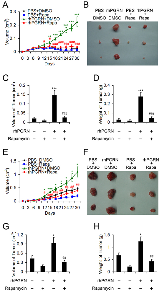 Figure 7: Rapamycin disrupted rhPGRN-induced tumor formation and growth in nude mice implanted with H8 or HeLa cells. Tumor growth curves A. and photographs B. of tumors with H8 cell implantation and treatment with PBS or rhPGRN concomitant with DMSO or rapamycin. Volume C. and weight D. of tumors from mice with H8 cell implantation and indicated treatment. Tumor growth curves E. and photographs F. of tumors with HeLa cell implantation and treated with PBS or rhPGRN concomitant with DMSO or rapamycin. Volume G. and weight H. of tumors from mice with HeLa cell implantation and indicated treatment. Data are mean ± SEM. *P< 0.05; **P< 0.01; ***P< 0.001 compared with PBS + DMSO. #P< 0.05; ## P< 0.01; ###P< 0.001 compared with rhPGRN + DMSO.