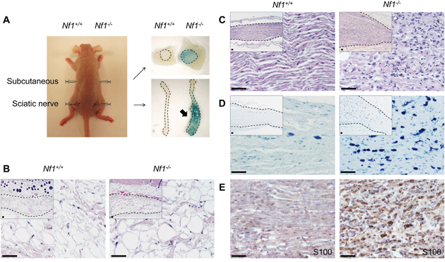Nf1-/- SKPs give rise to classic neurofibroma in sciatic nerve but not in subcutaneous tissue