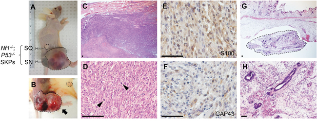 Figure 2: Nerve microenvironment also promotes MPNST development. Nf1-/-;P53-/- SKPs were injected under skin and into sciatic nerve in athymic nude mice to examine the contribution of nerve microenvironment to MPNST development. Tissues developed from Nf1-/-;P53-/- SKPs were harvested 2 months after injection. Nf1-/-;P53-/- SKPs proliferate remarkably fast in sciatic nerve but not under skin A&B. Nf1-/-;P53-/- SKPs in sciatic nerve differentiated into malignant tumor C&D., with mitotic figure (arrowhead) and positive staining for S100 E. and GAP43 F., consistent with MPNST. Nf1-/-;P53-/- SKPs differentiate into a small tissue under skin G&H. Arrows indicated the tumors formed in sciatic nerve. SQ = subcutaneous, SN = sciatic nerve. Scale bar = 50 μm.